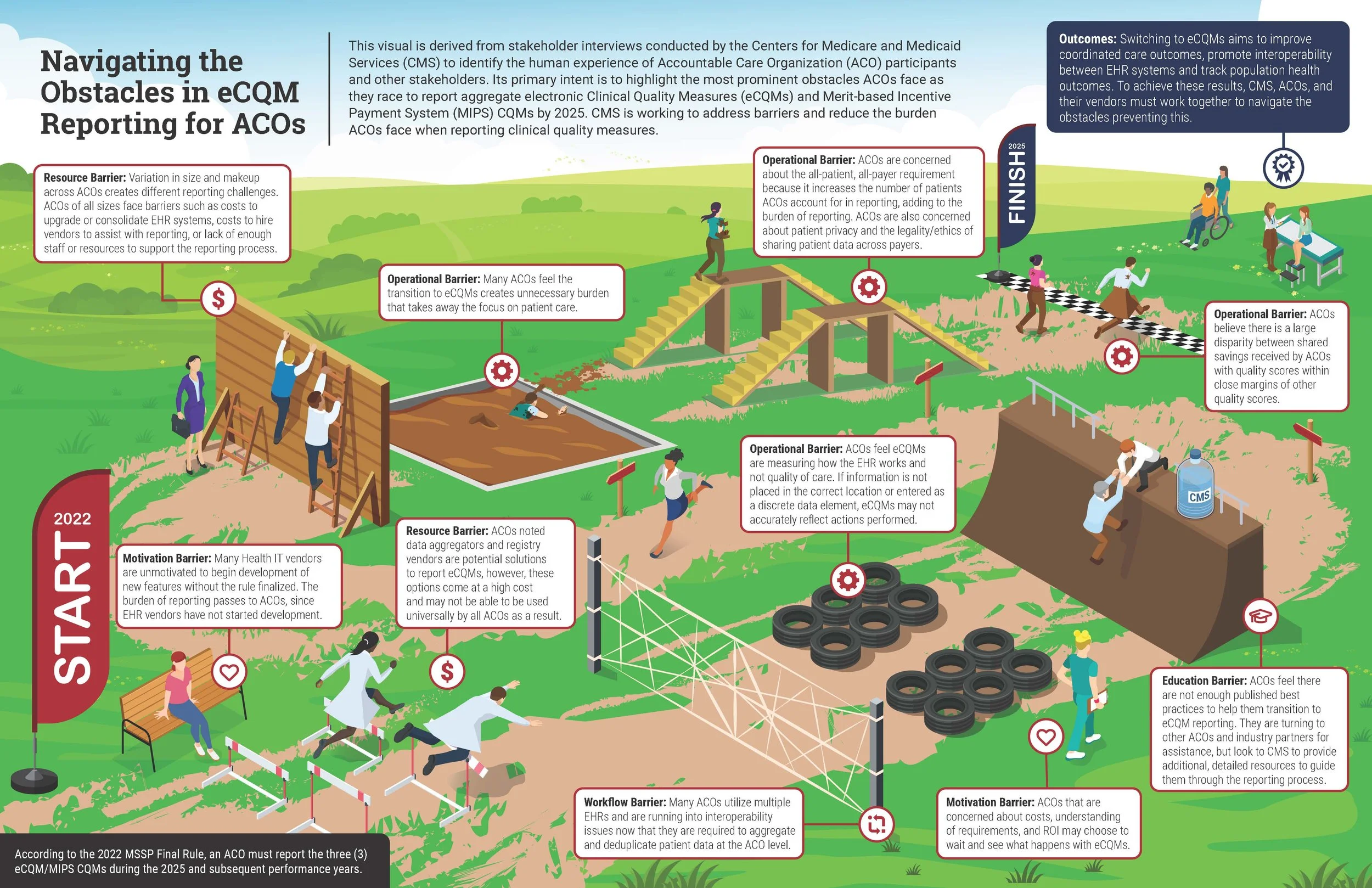 In 2022, I worked with a Human-Centered Design team at the Centers for Medicare and Medicaid Services (CMS) Office of Burden Reduction and Health Informatics (OBRHI) to understand the barriers to Medicare Accountable Care Organizations face as they move to meet CMS reporting requirements for aggregate electronic Clinical Quality Measures (eCQMs) and Merit-based Incentive Payment System (MIPS) CQMs. I led a team including design experts and policy analysts to interview multiple Accountable Care Organizations’ leadership, electronic medical record vendors and other key stakeholders to understand and then visually communicate their challenges.